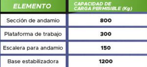 Equipos para trabajo en alturas de la marca ÜBERLINK certificados que cumplen las normas técnicas colombianas NTC1641 y NTC 1642, comprenden secciones de andamio, escalas internas, plataformasde trabajo y barandas de seguridad, con capacidad decarga permisible con un factor de seguridad de 2, de los diferentes elementos del equipo fabricados en acero son las siguientes: